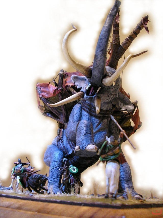 En este diorama se muestra un mumak modelado, cinco rohirrims "transformados", un mahud y 12 haradrims.
