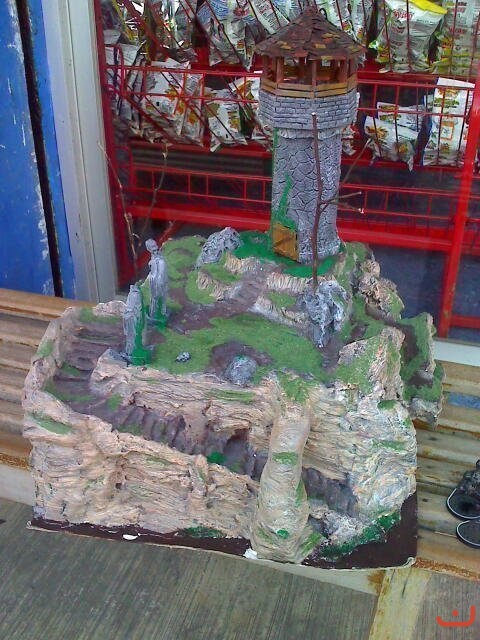 Mi primera maqueta. No sbía que se utilizaban materiales especiales, así que la hice con carton, yeso, pinturas indelebles etc. Esta maqueta la utilizamos para jugar al Señor de Los Anillos a ver quien aguataba más tiempo en sobre la torre.