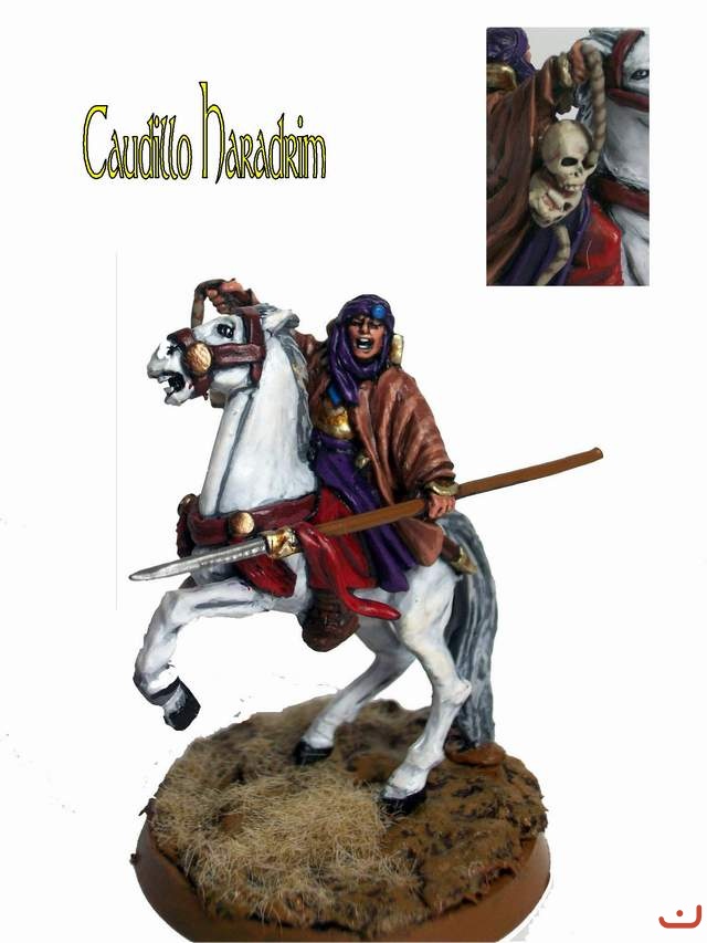 La miniatura parte del nuevo modelo de Gandalf el Blanco. Se le ha cortado la cabeza y se la ha sustitudo por la de un haradrim. Para los trofeos de carabelas se utilizaron accesorios de la marca Enigma Miniatures.