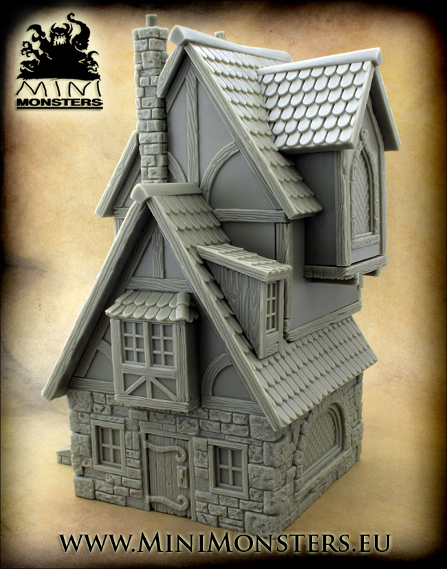 -Tabletop World: la estética la veo perfecta para Bree, por lo menos en muchos de sus edificios. La escala a priori es para 28 mm, pero según he podido ver en muchas reseñas es más válida para nuestro juego, de hecho abajo os pongo una foto comparativa con minis de Fantasy, aunque si tenéis dudas abajo de cada producto viene sus medidas, por lo que no debería de haber problema.
