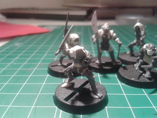 Pues bien, aquí os traigo los avances que he hecho con mis caballeros elfos. Por ahora, les he metido un par de colores base para luego ir iluminando y colocando los detalles: