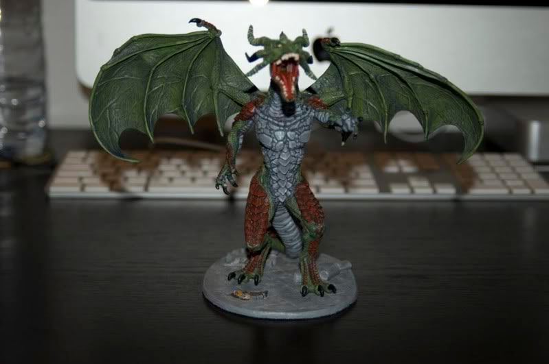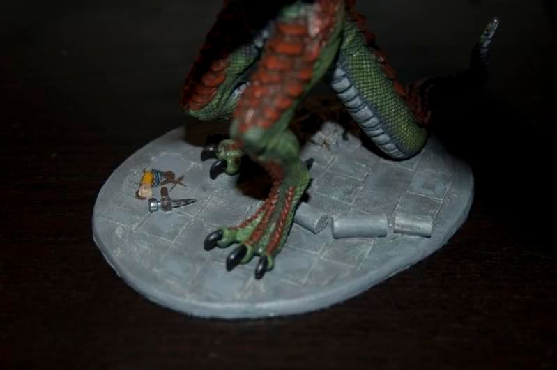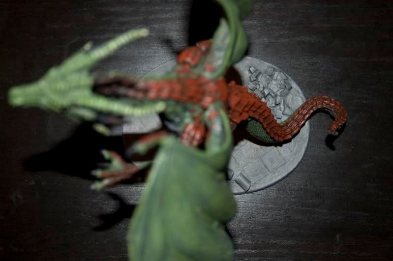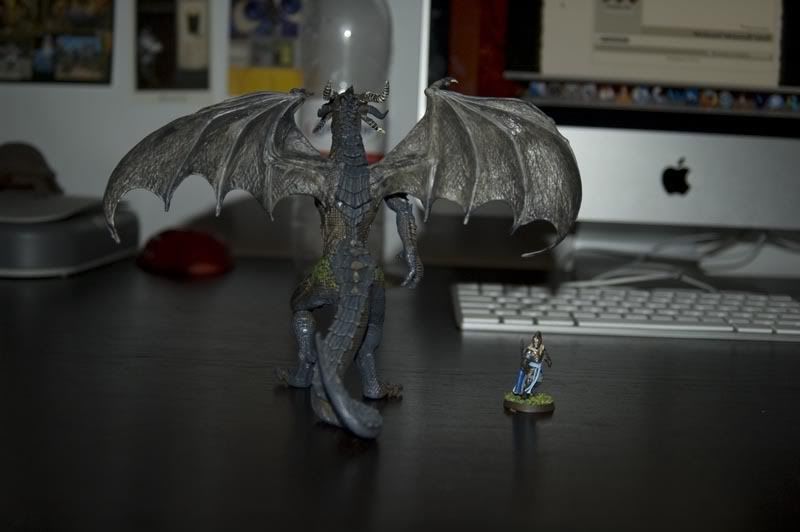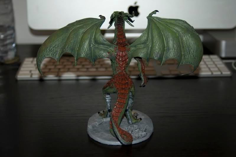Sobre la escala, yo no lo veo grande para nada, me parece un tamaño perfecto para las minis del juego. El de GW me pareció pequeño cuando lo vi (creo que por estar en horizontal y no sobre dos patas como el tuyo), sobre todo las alas. Pero como bien has dicho, dragones hay de varios tamaños y para mí el que te has agenciado está cojonudo.