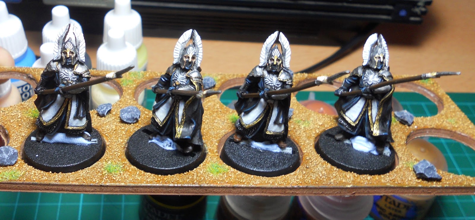 Pues bien, tras un mes parado, vuelvo con nuevos proyectos y encargos, en esta ocasión son 4 Guardias del Patio del Manantial y dos Aragorns: