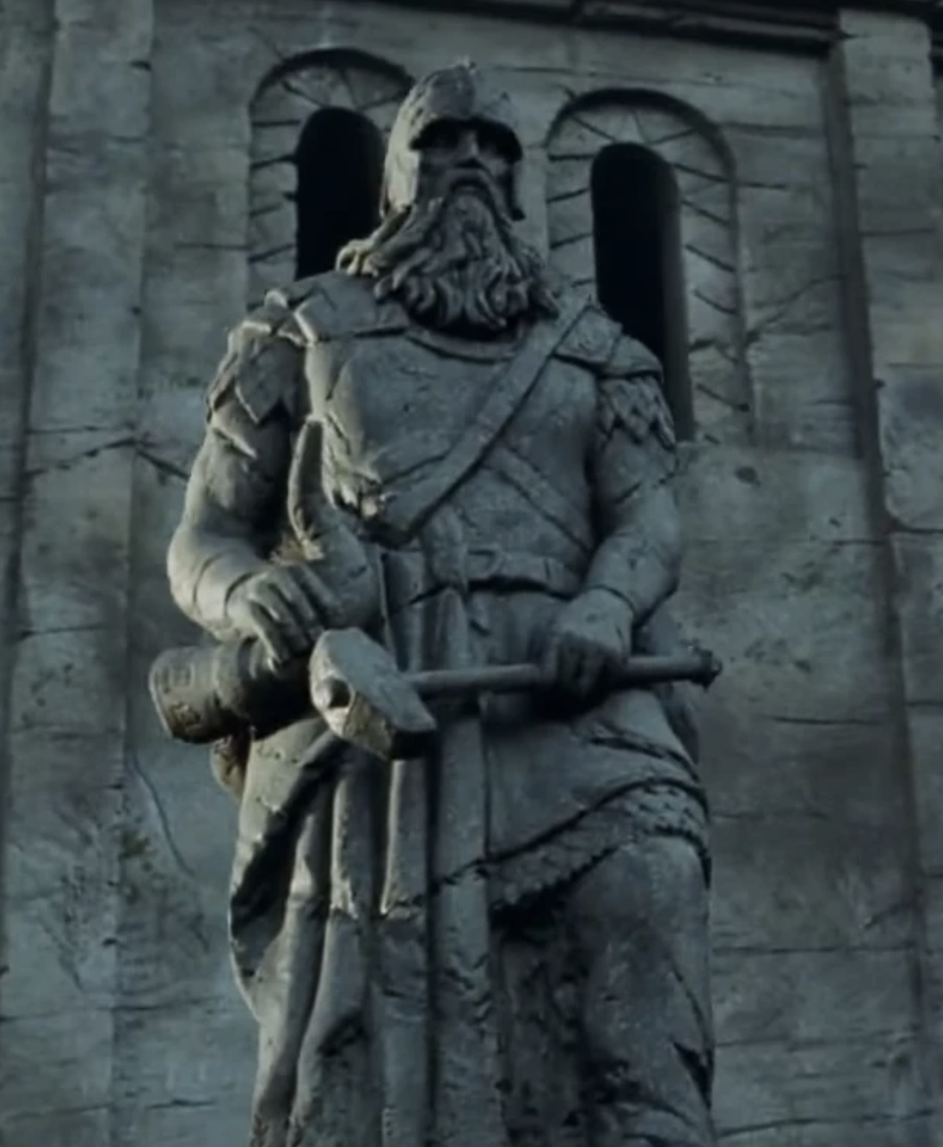 Existiendo ese Lore previo se la estatua (que no tienen que ser tal y como eran en realidad los personajes) no entiendo por qué la película de animación no lo aprovecha haciéndolo similar. Que menos que llevar una espada en vez de un martillo gigantesco totalmente desproporcionado. Y el casco lo mismo.