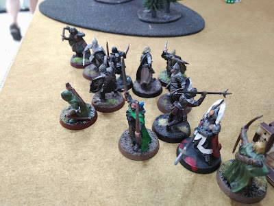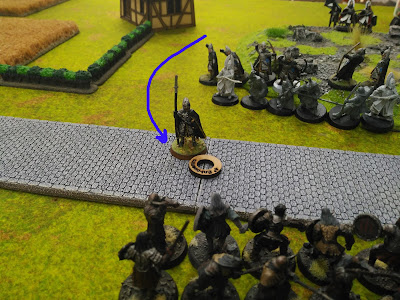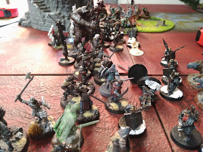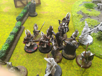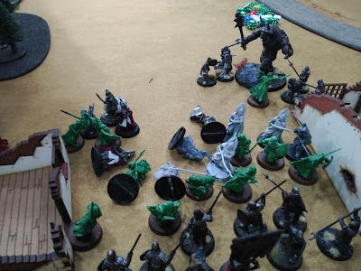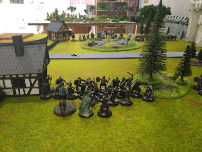 En el turno siguiente, perdí el chequeo de movimiento, hecho que permitió a suladan rodear al rey y a su heredero, pero con la situación de Theoden mucho peor. El mumak, cargo contra lo que pudo, acabando con tres haradrim. Grimbol y los suyos cargaron contra los jinetes haradrim, y Eomer con su guardia real al mumak. La fase de disparo acabo con más bajas del castillo, y en la fase de combate, eowyn junto a grimbol hicieron un combate Heroico, que acabo con su jinete, y cargaron a los siguientes, matando grimbold el jinete que acababa por desmoralizar el enemigo. Suladan acabo con el rey tehoden, y la partida acabo por falta de tiempo (la tienda cerraba), y con el resto de los combates sin determinar.