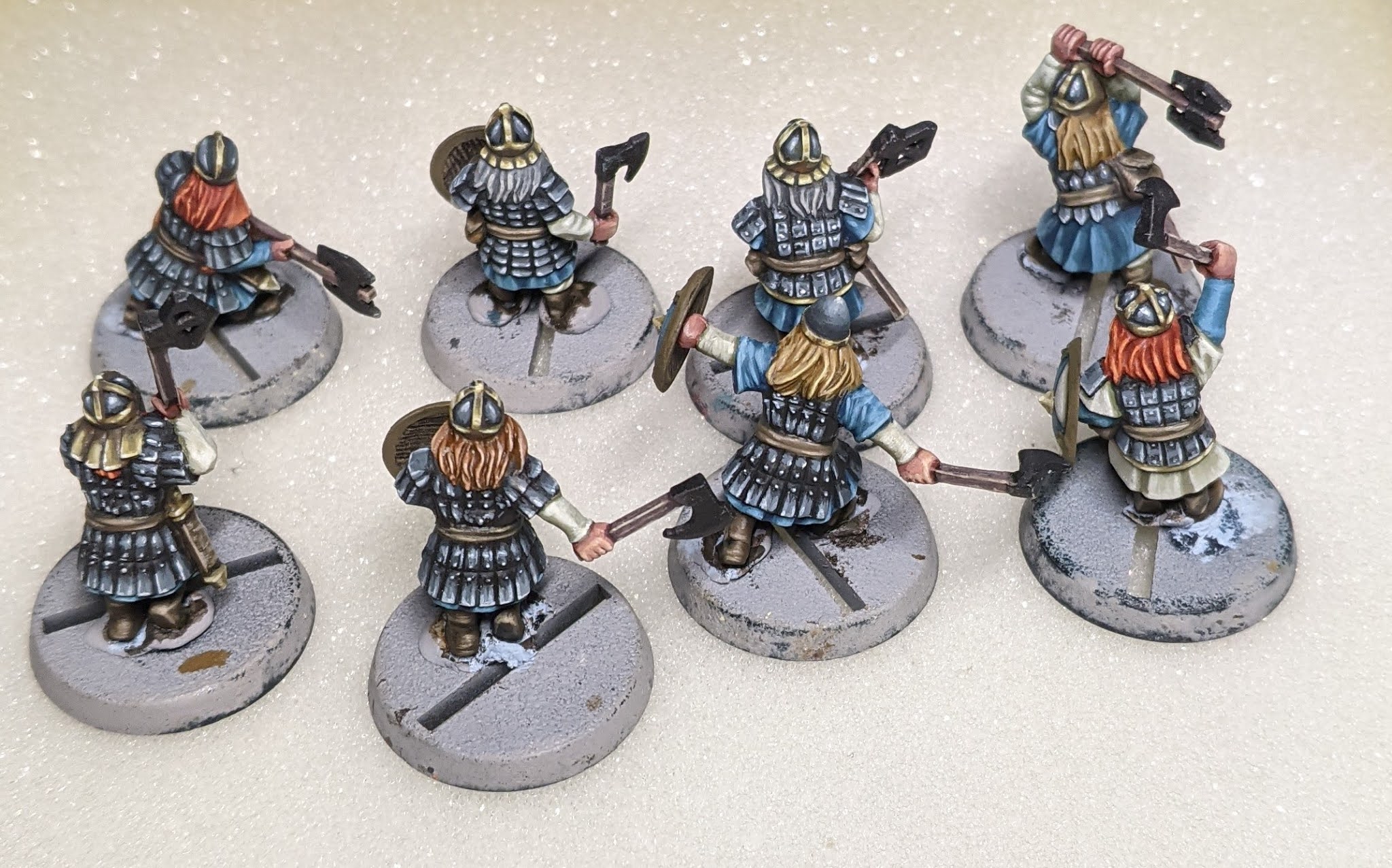 A falta de un par de días aun me queda bastante curro por lo que solo me dará tiempo a estos 8 y sudando, aun me quedan hachas, bases y escudos (solo están planteados, falta pulirlos), y un sinfín de detalles pendientes y definiciones, aun así los veo bastante avanzados y me gusta el esquemilla que va cogiendo el ejército de enanos