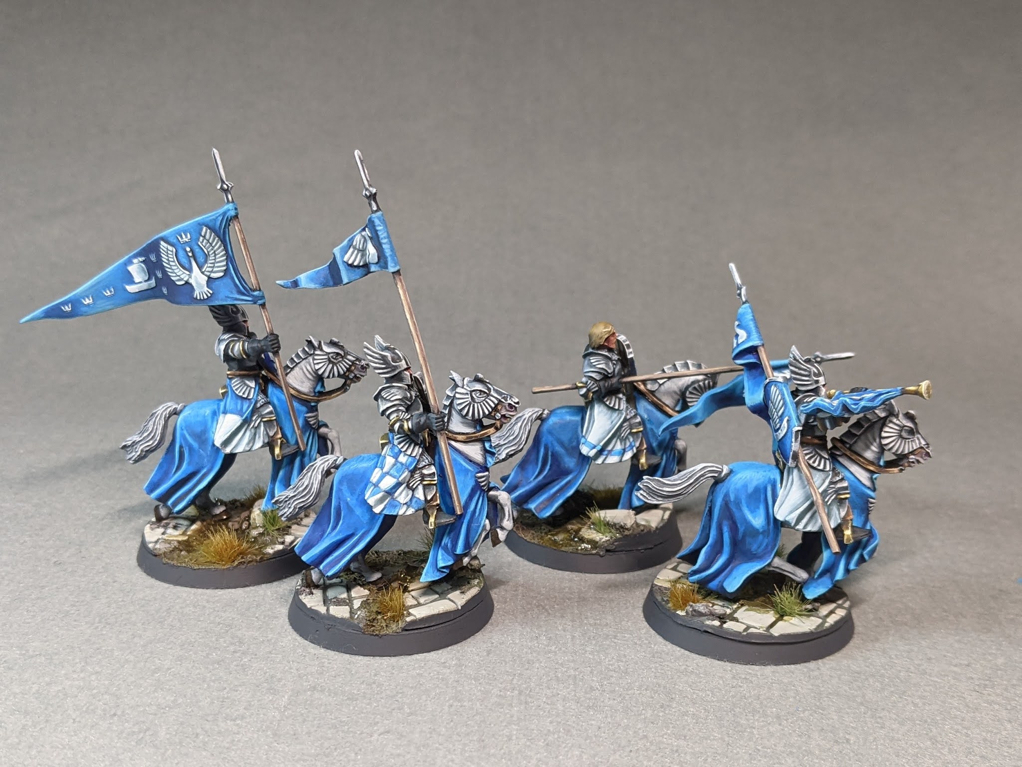 Aquí presento mis caballeros de Dol Amroth. Pinté los más representativos de la caja, el comandante, musico y estandarte además de otro soldado con el que me animé a hacer un freehand para la falda jejeje