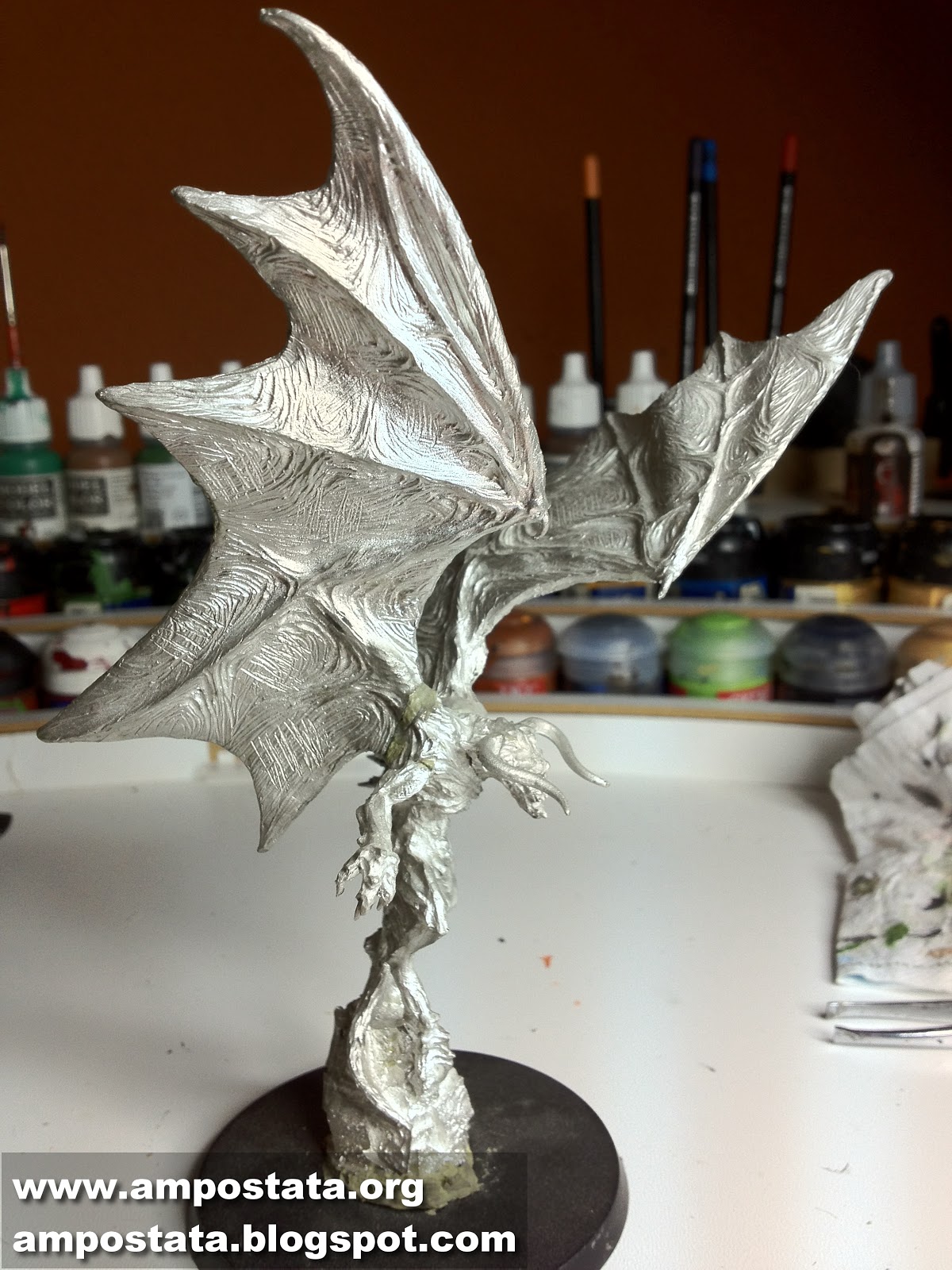 Aquí ya la podeis ver más clara, en el anterior no tenía el ultimo pincel seco. Como la miniatura es de poco colorido y tenía por aquí rodando el liquido para hacer agua, decidí hacer una pena chula. Pegué a la peana piedras pequeñas, y luego encima unas cuantas grandes. Una vez secas, pincel seco gris y remate de seco marrón, que usé también para la piedra donde está subido. Pegué al fondo un par de lanzas que había por ahí y un esqueleto, que ni recuerdo de donde saqué, estaba sobre una peana cuadrada tipo Warhammer Fantasy. Y una espada rota de El Señor de los Anillos. A saber el elfo que la portaba donde estará.